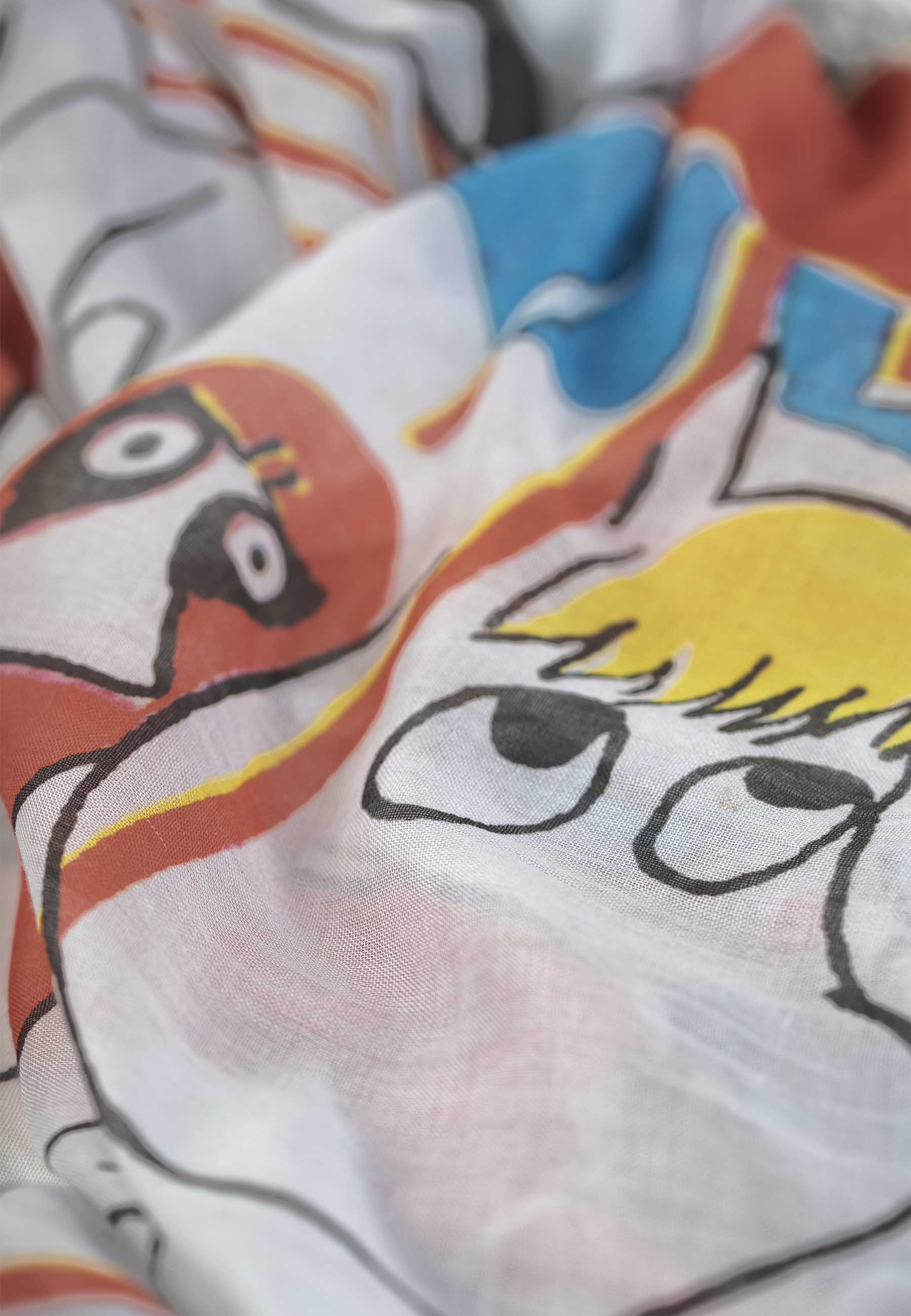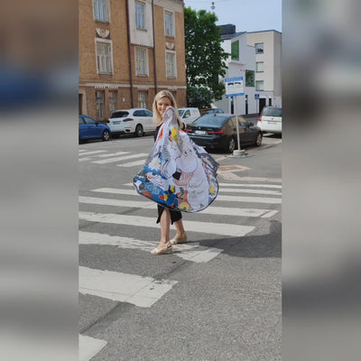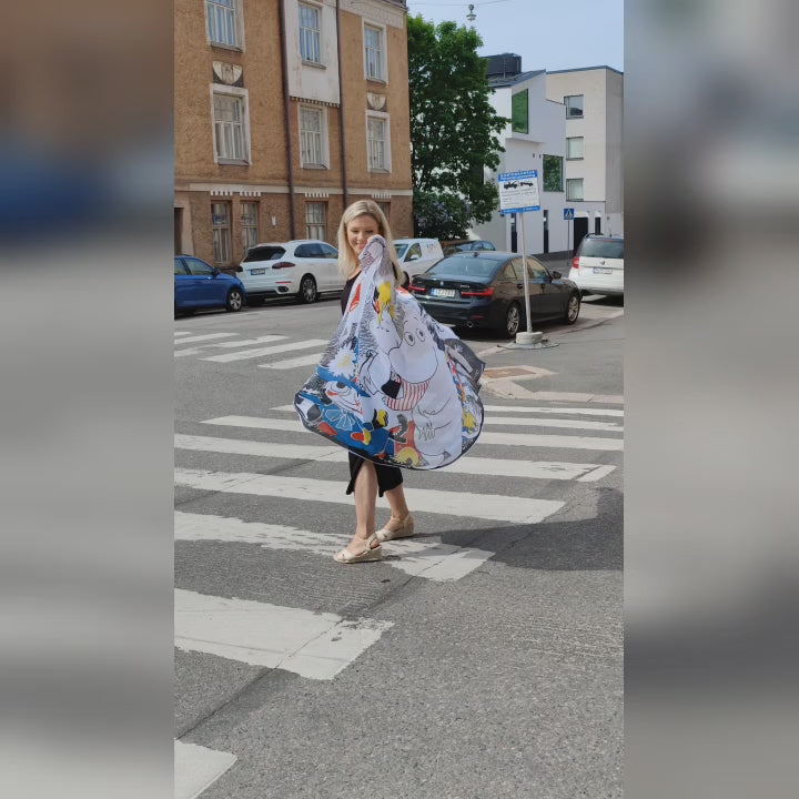 The size of the Moomin Number 1 scarf is 107x180cm. The pattern is digitally printed on the scarf. The material of the scarf is very soft 100% modal. Modal is a cellulose-based modified fiber that is slightly more resistant to viscose. It's like cotton, but softer and very pleasant on the skin. Numero 1 scarf is large, thin and soft. The scarf is comfortable to wear both around the neck and as a shoulder scarf. A scarf is nice to brighten up and finish, for example, black clothes when you go to children's birthday parties, to go out with children or other good company, or just by yourself.