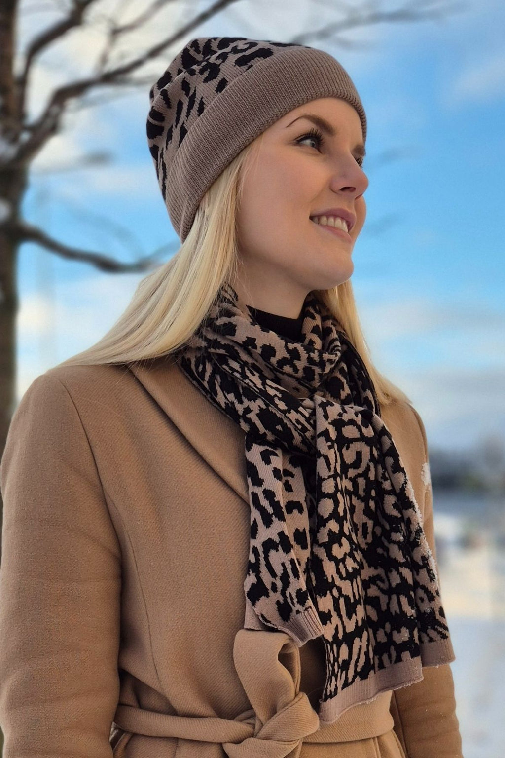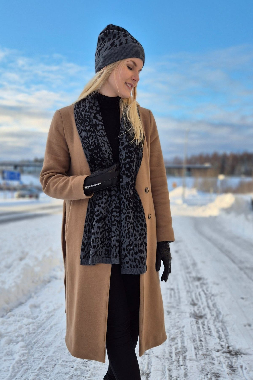 Adilla kaulaliinassa on trendikäs pantterikuosi. Kaulaliinan materiaali on mielyttävää ja pehmeää merinovilla/akryyli/polyster sekoitetta, joka on sama materiaali kuin esimerkiksi suositussa Juolas-ponchossa. Kaulaliinan neulos on notkeaa ja se helppo solmia kaulaan. Voit yhdistää sen samaa kuosia olevaan Aida pipoon. Mikä on sinun suosikkisi kolmesta värisävystä?